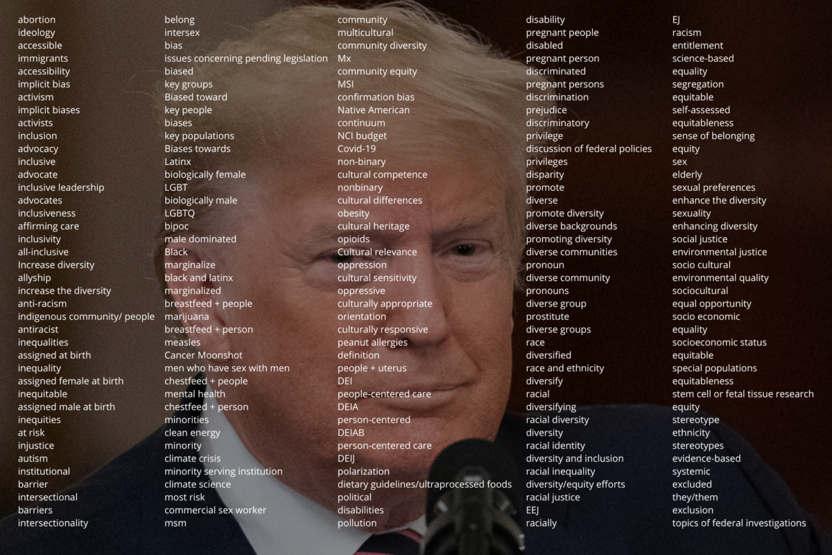 Det finst inga offentleg liste over forbodne ord, men ytringsfridoms-organisasjonen PEN America har samla ei oversikt basert på rapportering frå The New York TimesReutersThe Washington PostPropublicaScienceGizmodo404 Media, og Popular Information.