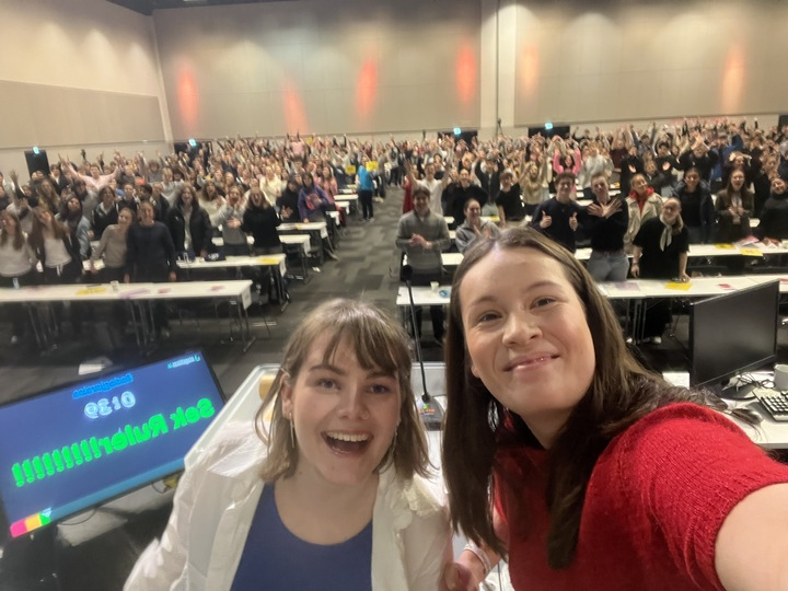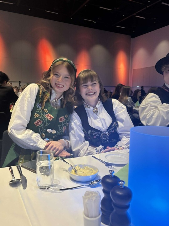 Martine Svendsen (t.h.) og styremedlem Alette Lehne Bergli under banketten på Elevtinget. | Foto: Privat