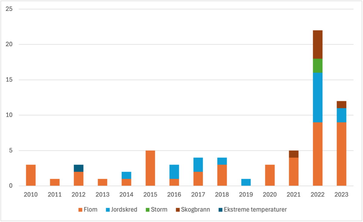 I tillegg til mangelfull vassforvaltning har regionen også låge nedbørsmengder og ei veksande befolkning. Samtidig førar klimaendringane til hyppigare ekstremvêr som flaum og tørke. Talet på miljøkatastrofar i Sentral-Asia har auka mykje dei siste åra (sjå Figur 1). Auka snøsmelting tidleg på våren og kraftige regnbyer i fjellområda om sommaren fører til at fløymer og jordskred rammar oftare ein før. Mellom 1992 og 2024 forårsaka vêrrelaterte katastrofar 2046 dødsfall i Tadsjikistan, 329 i Kirgisistan, 243 i Kasakhstan og 41 i Usbekistan.