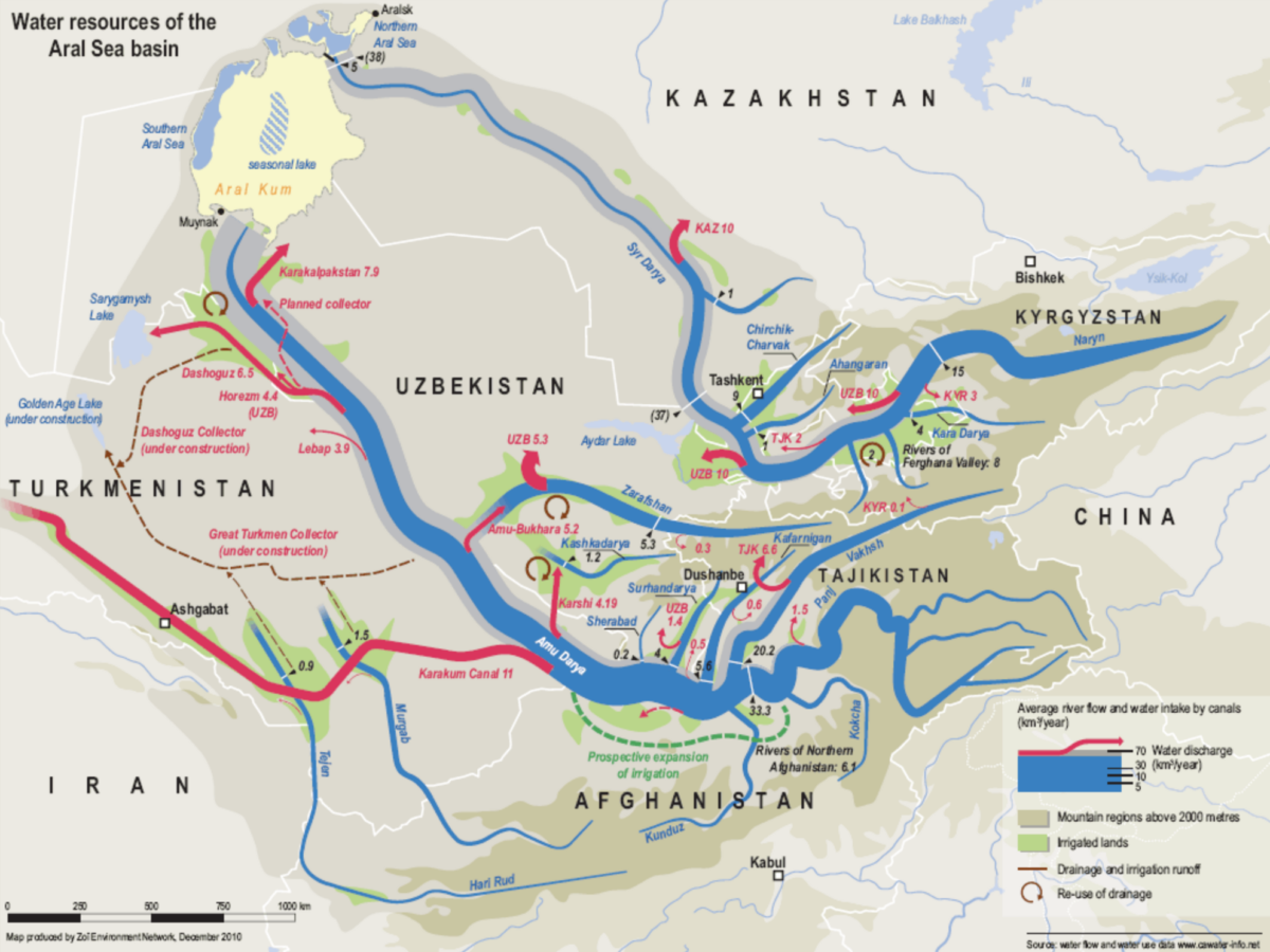 Som om ikkje dette var nok, er også jordbruket i regionen avhengig av vatnet frå dei to grensekryssande elvane Amu Darya og Syr Darya. Desse har utspringet sitt i fjella i Kirgisistan og Tadsjikistan, og saman dannar dei nedbørsfeltet til Aralsjøen, som er ei viktig vasskjelde for heile regionen. Sårbarheita i slike situasjonar kjem tydeleg frami bygginga av Qosh Tepa-kanalen i Afghanistan. Når kanalen står ferdig, kan han potensielt leie bort opptil 60 prosent av vatnet frå Amu Darya. Dette kan få katastrofale konsekvensar for Usbekistan og Turkmenistan, som er spesielt avhengige av vatnet frå elva, men det vil også kunne true stabiliteten i heile regionen.