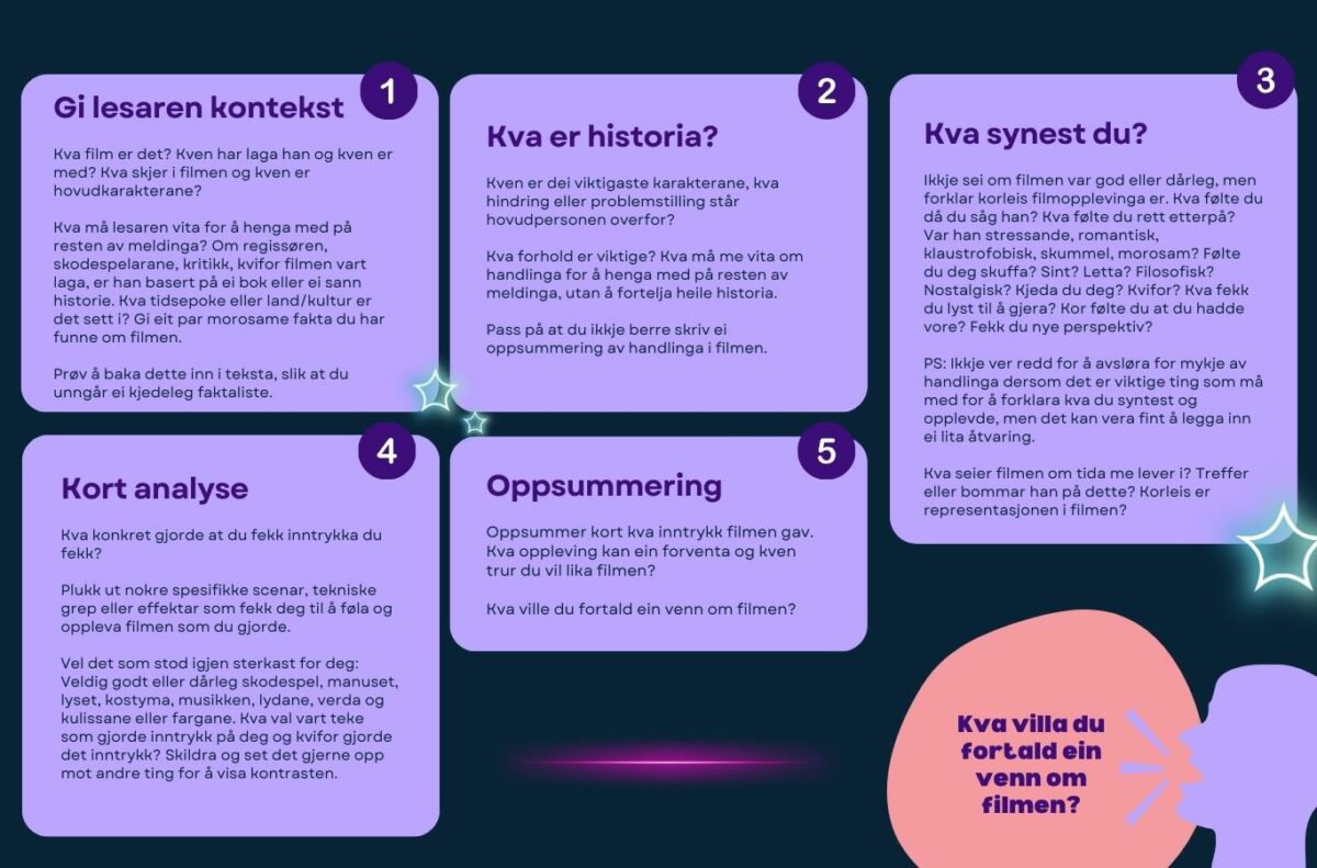 - Oppsummer kort kva inntrykk filmen gav. Kven trur du vil like filmen og kva oppleving kan ein forventa?