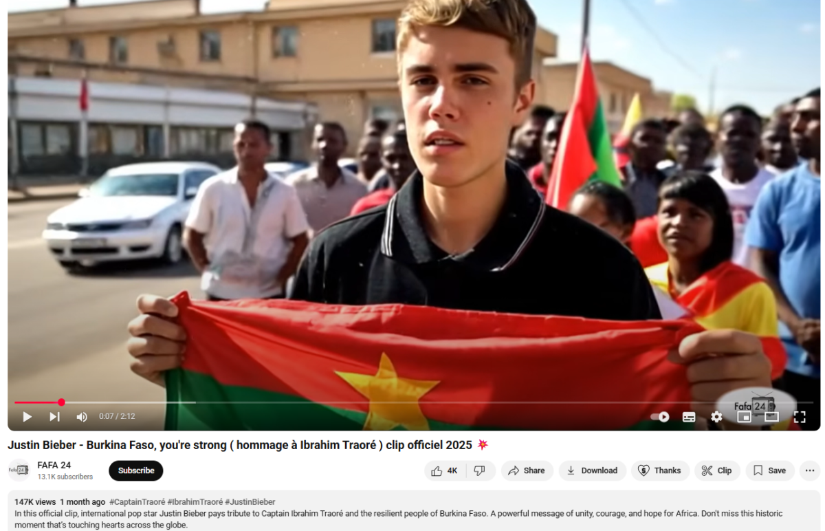 – I samband med dette kom det ein sverm av some-innhald, mykje av det truleg bot-generert, mellom anna ei rekke KI-musikkvideoar med popstjerner som Beyoncé, Justin Bieber, Drake og Shakria, som hylla Traoré og hans mot.