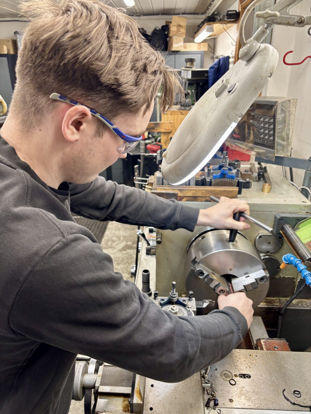 Sander Stana står bøygd over ein dreiebenk med eit skuvelêr og måler diameteren på eit sylinderforma stålrøyr. Saman med eit kammer skal løpet etter kvart utgjere pipa på ei rifle.