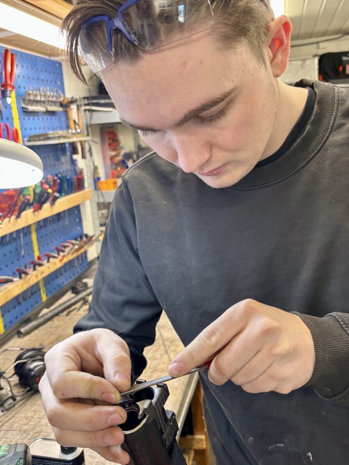 Det har han gjort sidan han tok sveineprøva som børsemakar på Gauldal videregående skole på Støren i Trøndelag i 2021. I tillegg har han gått Brønnteknikk VG2. Det gjer at Sander kan ta på seg sporadiske jobbar på anlegg og verft som mekanikar, flaggmann og riggar når det er stille i verkstaden.