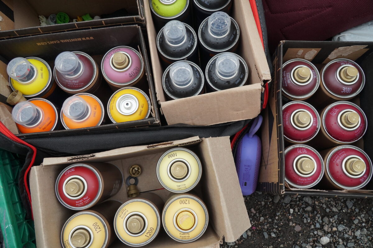 I ein søppelsekk som heng på gjerdet, ligg alle sprayboksane som har vore nytta i prosjektet så langt. Den nedste delen av måleriet er ikkje ferdig, men tjue boksar er allereie tømte.