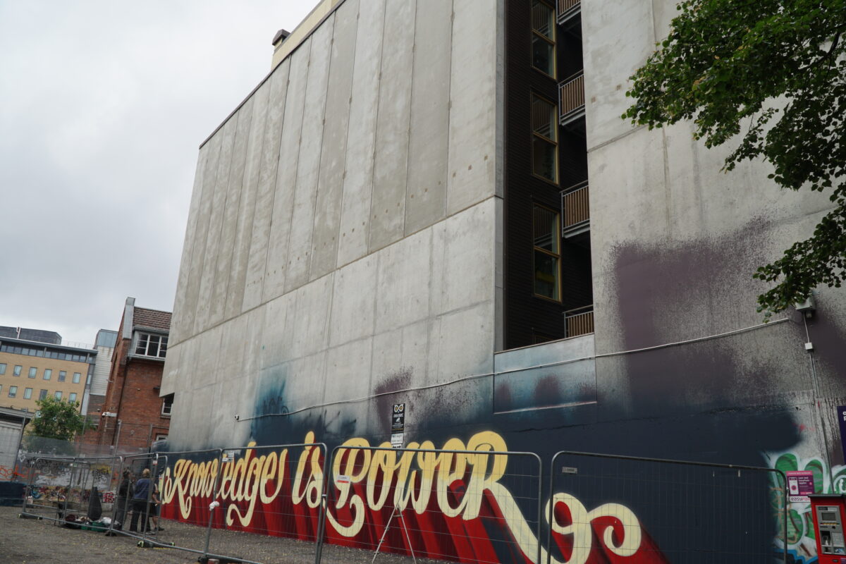 Saman med studentar, lagar graffitiartist Flexi Aukan (38) og gatekunstnaren AFK Oslo sitt største veggmåleri, i kampen for ei betre verd.