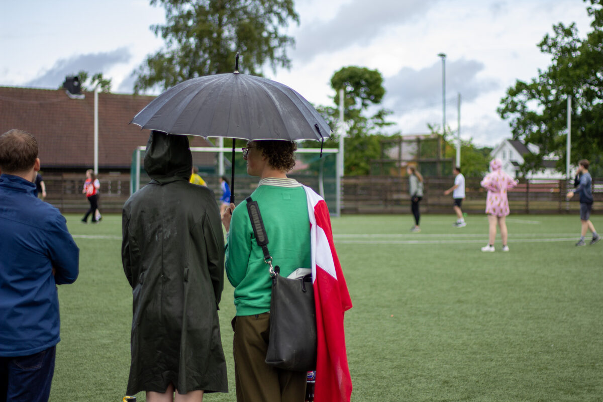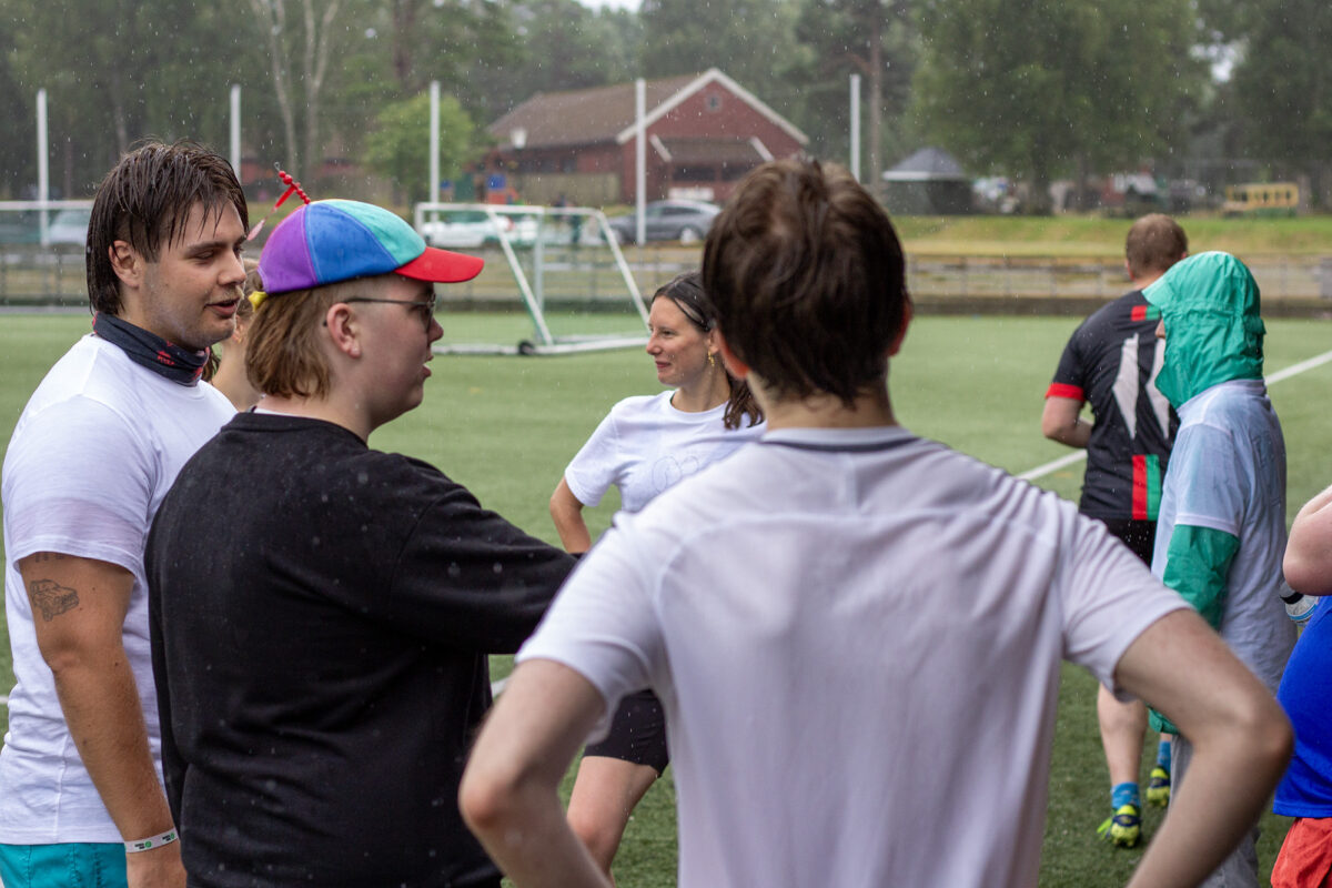 Fotballturnering dominerer første del av dagen. Det vekslar mellom regn og sol, og eit roterande utval kommentatorar gøymer seg under ein paraply medan dei tullar med laga som knivar om finaleplass: