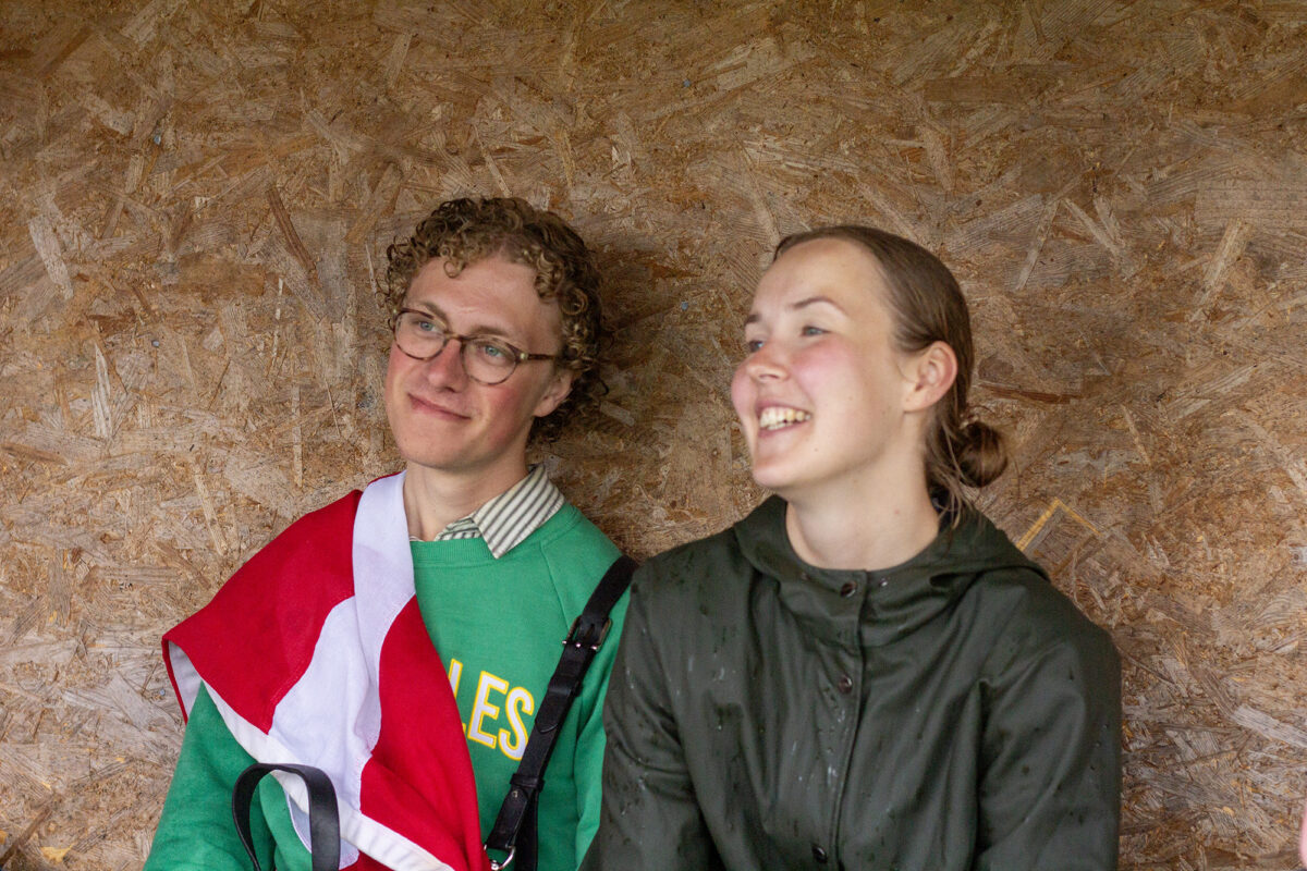 Han snur seg til naboen Maja Sivebæk Aarup (22), som også er frå København.
