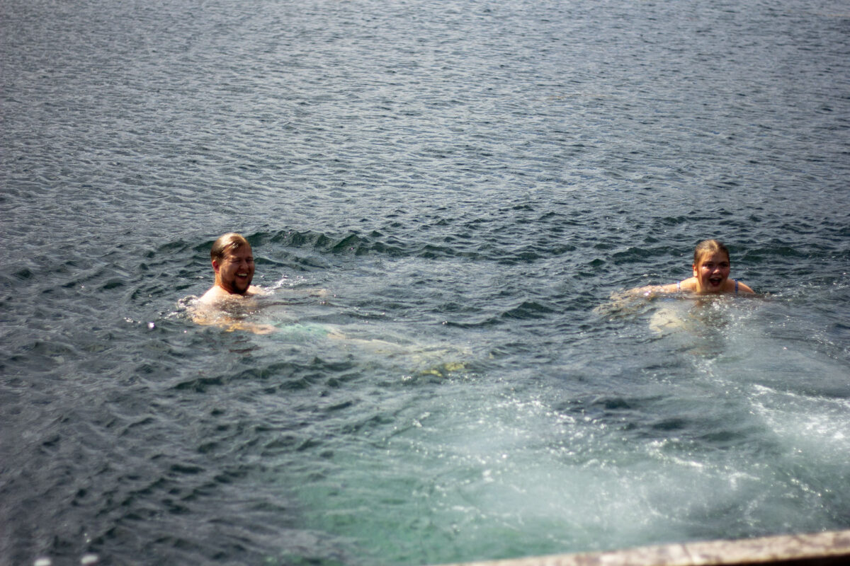 Dei frivillige badevaktene godkjenner ein badeplass, og dei mest badeglade stiller seg opp.
