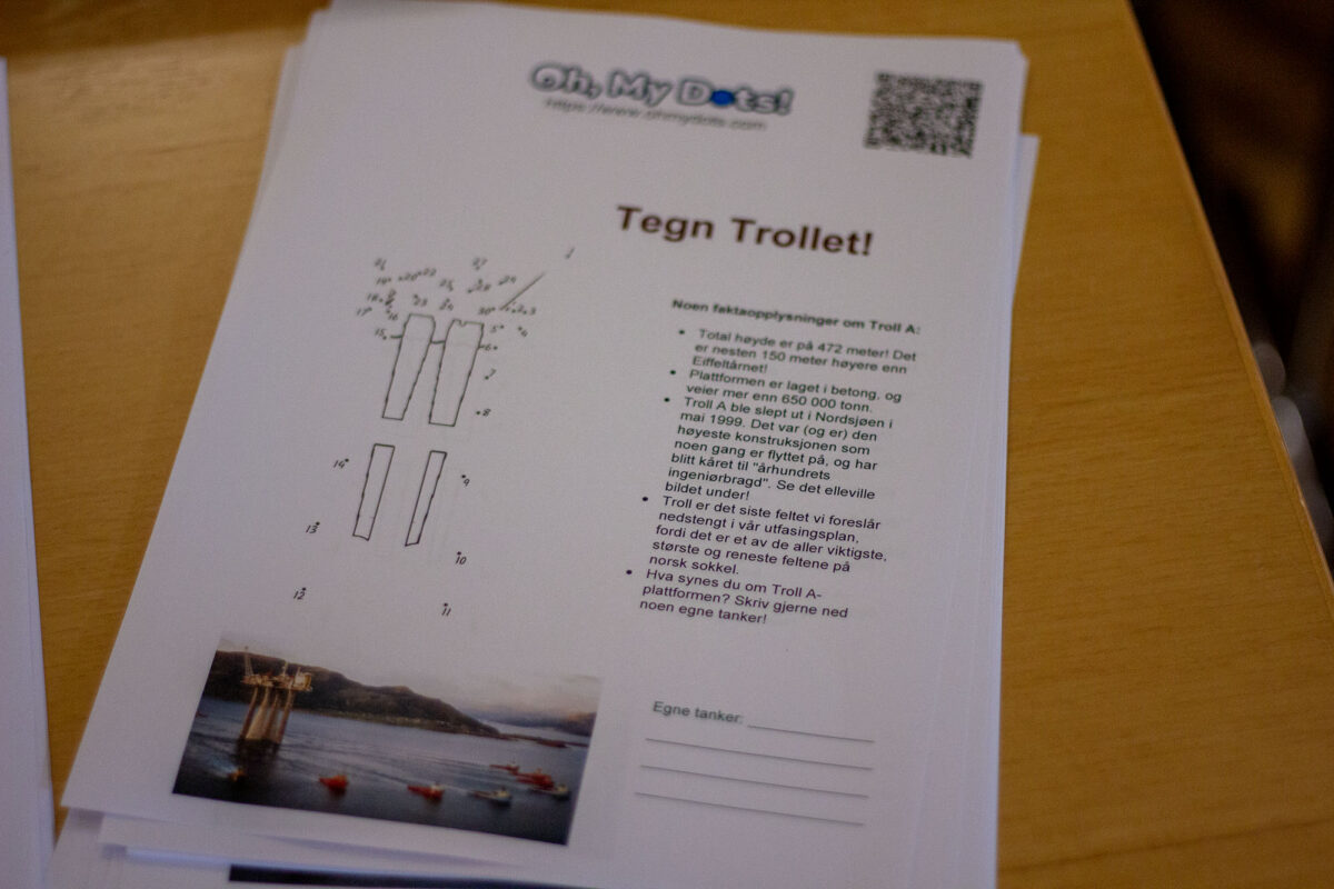 Bak i sélen er det ark med «Teikn trollet» (punkt-til-punkt-teikningar av oljeplattforma), gamle banner frå tidlegare sommarleirar, og informasjon om norsk sokkel.