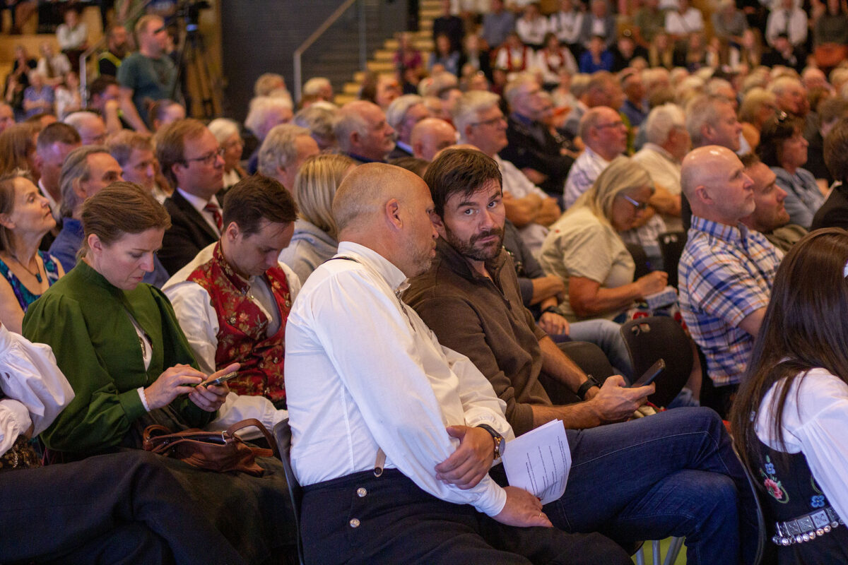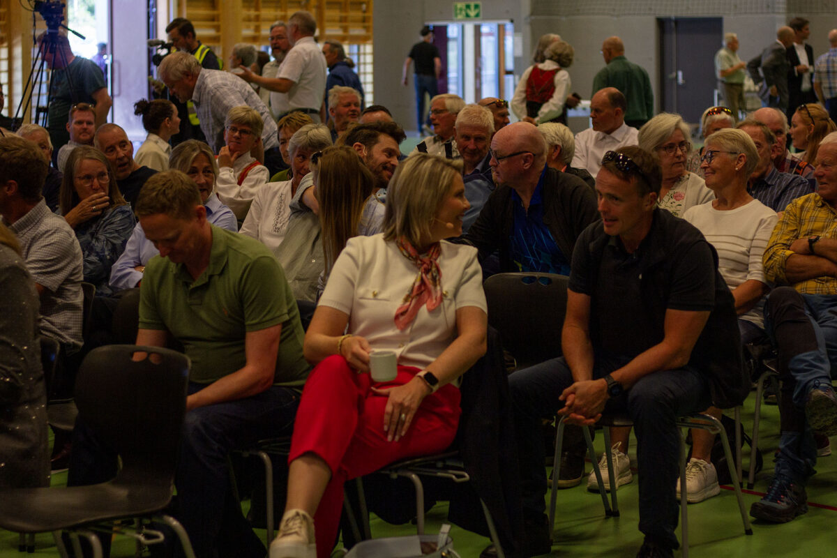 Senterpartileiar Trygve Slagsvold Vedum er tilbake i fylket sitt med bunaden på. Stortingsrepresentant Rune Støstad (Ap), Bjørnar Moxnes frå Raudt, Geir Lippestad frå Partiet Sentrum, Fridtjof Bjerke frå Konservativt (tidlegare Dei Kristne), Pensjonistpartiet og Bygdelista i Lom er alle til stades i gymsalen der det er lagt opp til debatt.