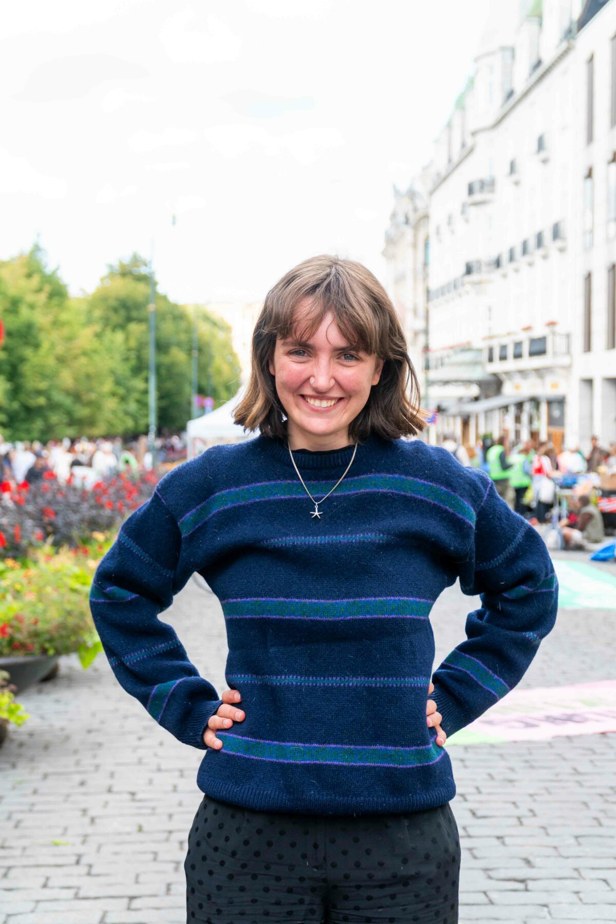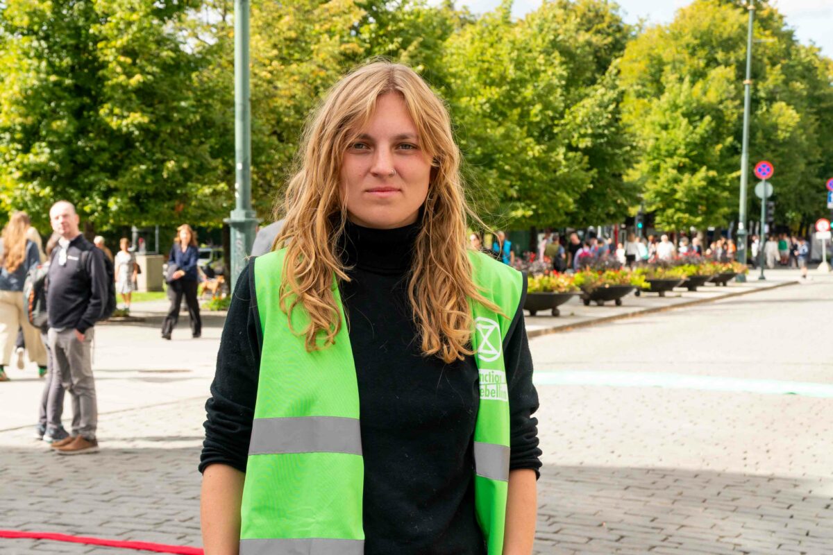 Ho har teke turen frå Danmark for å støtte klimaaktivistane i Extinction Rebellion som har blokkert Karl Johans gate i Oslo torsdag 21. august. I Danmark er ho del av Den grønne ungdomsbevegelse.